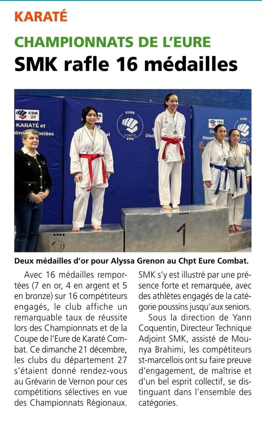Avec 16 médailles remportées (7 en or, 4 en argent et 5 en bronze) sur 16 compétiteurs engagés, le club affiche un remarquable taux de réussite lors des Championnats et de la Coupe de l’Eure de Karaté Combat.